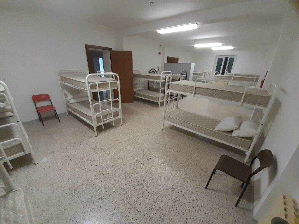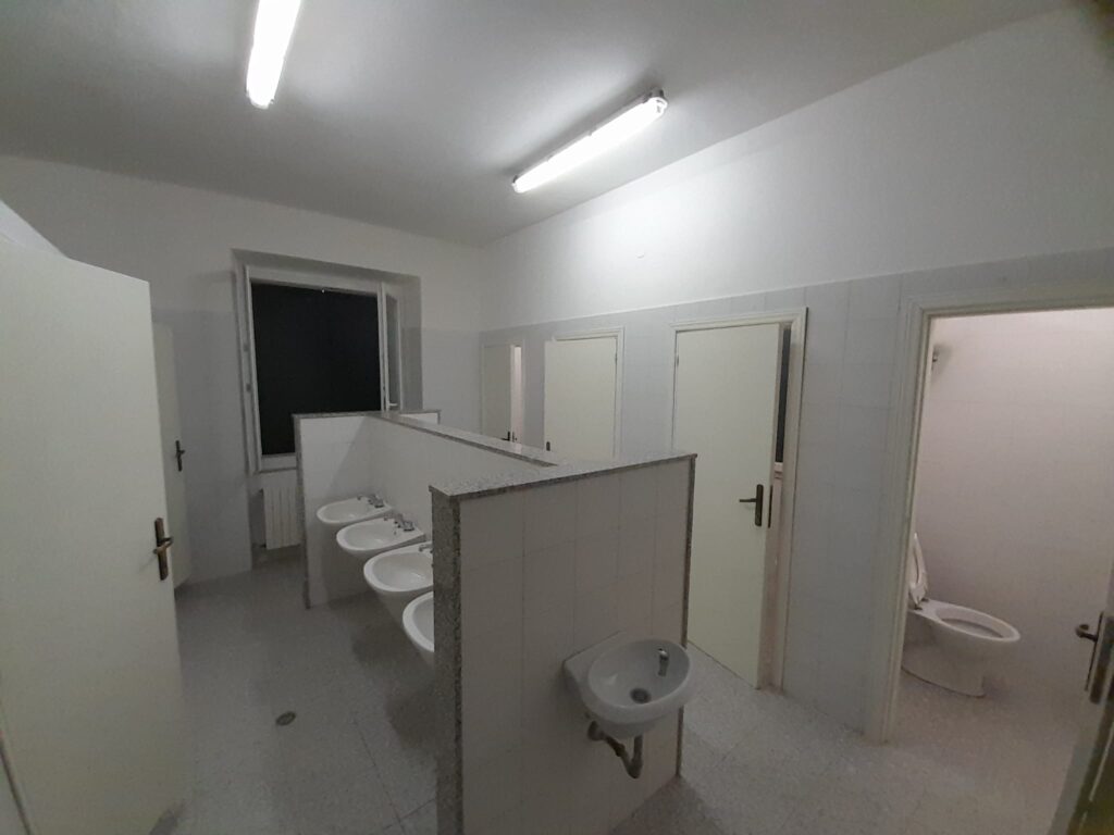 - Al 1° e al 2° PIANO – raggiungibili solo con una scala, senza ascensore – si trovano una grande camera con 9 letti a castello; una camera con 1 letto a castello; una camera con 2 letti a castello cui è annesso 1 bagno; 1 bagno in comune con 3 box docce, 3 WC e una batteria di lavandini e lavapiedi.